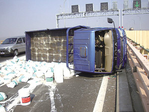 涂料貨車六個輪胎爆四個 失控翻車貨撒高速路