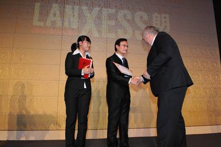 圖為在12月2日朗盛橡膠日,青島科大兩名優秀學生接受朗盛頒發的獎勵證書,他們將前往德國接受為期4周的實習。