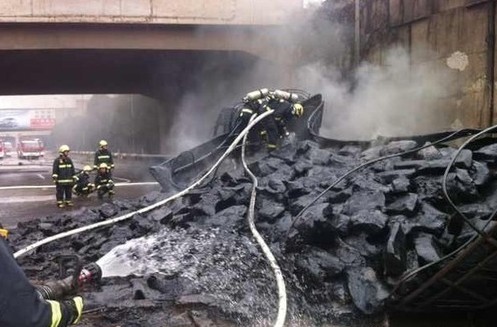 10點14分,火勢已被基本撲滅,但大貨車和車上的橡膠已幾成灰燼,所幸無人員傷亡。