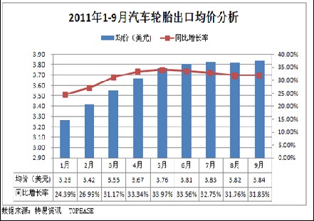 特易資訊2011年1-9月汽車輪胎出口均價(jià)數(shù)據(jù)顯示:2011年1-6月汽車輪胎出口均價(jià)呈上升態(tài)勢(shì),7月到9月出口均價(jià)保持穩(wěn)定。與2010年同期相比,2011年1-9月各月出口均價(jià)均同比增長(zhǎng),而且同比增長(zhǎng)率月度趨勢(shì)與出口均價(jià)趨勢(shì)基本相同,前5個(gè)月呈增長(zhǎng)態(tài)勢(shì),5月開始至9月同比增長(zhǎng)率基本保持穩(wěn)定。