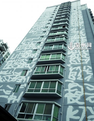 日前,一位網友在泉州網溫陵社區上發帖稱,晉江新世紀豪園驚現甲骨文(火星文)大廈。記者實地探訪,大廈外墻密密麻麻的符號,不是甲骨文,也不是火星文,而是修復墻體漏水留下的涂料痕跡。