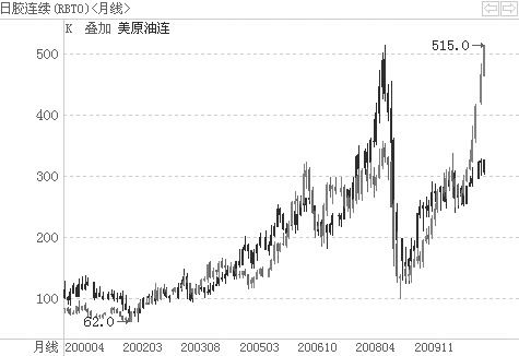 2010年,中國汽車制造突破1800萬輛,世界汽車產量也已突破2007年創下的7300萬輛大關,而這一切在進入2010年下半年后才逐漸明朗,與此同時,在割膠季節東南亞主產國泰國又遭遇了罕見的洪澇災害,于是就出現了2010年8月份之后天膠價格的井噴行情,并一直持續到現在。雖然,在終端需求環節原油和天膠價格可以存在背離,但合成膠與天膠價格之間的參照關系也可以逐步收斂兩者之間的價格背離——要么原油價格向上補漲,要么天膠漲勢已接近到了盡頭,而筆者更傾向于對后者的判定。