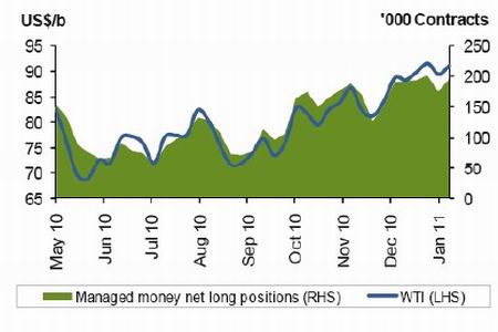 2007、08年國際原油價格的大幅飛漲(WTI原油價格達(dá)到147.25美元/桶)被普遍認(rèn)為是全球經(jīng)濟(jì)衰 退的主因之一,目前市場普遍擔(dān)心如果國際原油價格超過100美元/桶,將會對復(fù)蘇的全球經(jīng)濟(jì)(尤其是剛 剛恢復(fù)的歐洲經(jīng)濟(jì))造成打擊。目前,OPEC認(rèn)為國際原油價格上漲不乏投機(jī)者操作,短期內(nèi)預(yù)計不會有大 幅調(diào)整。據(jù)路透報道,一名OPEC代表稱,OPEC成員國部長將于2月22日在沙特阿拉伯舉行的一次國際能源 大會間隙,討論原油產(chǎn)出政策。