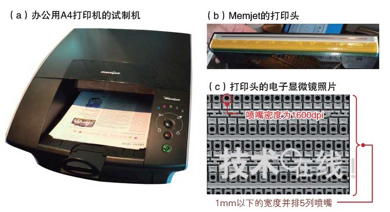 Memjet公開了打印機的試制機(a)。預定產(chǎn)品2011年上半年由聯(lián)想上市。(b)為線性噴墨打印機的打印頭。寬度約為220mm。(c)為打印頭的電子顯微鏡照片。噴嘴密度為1600dpi,是普通噴墨打印機用打印頭的17倍。使用染料類油墨。