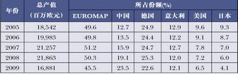 2005-2009全球塑機(jī)主機(jī)產(chǎn)值。EUROMAP代表10個(gè)歐盟國家,包括德國和意大利。數(shù)據(jù)來源:VDMA。