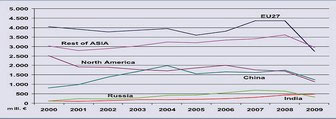 從2010年6月到年底,在不同的新聞發(fā)布會(huì)上,從協(xié)會(huì)到各業(yè)內(nèi)領(lǐng)先設(shè)備、原料供應(yīng)商,在談到2010年的業(yè)績發(fā)展時(shí),筆者聽到最多的是:“最大的帶動(dòng)在亞洲市場,尤其是中國”或“尤其是中國、印度市場”。