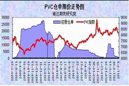 此外,從大商所PVC的庫存倉單也持續減少也對PVC形成一定的支撐。截至2011年3月11日止,大連商品交易所庫存倉單僅為567張,較2月末的1284張大幅減少了717張,目前處于歷史低位區域,倉單持續減少,一方面說明市場上PVC的庫存量有所下滑,另一方面也說明目前PVC期貨價格已處低位,現貨商不認同不斷下滑的價格而減少PVC的倉單入庫,這兩個因素短期都將為PVC的價格提供一定的支撐。