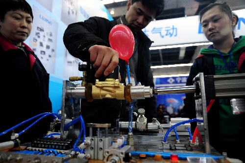 2011年3月22日,第十四屆中國東北國際儀器儀表及工業自動化展覽會在沈陽舉行。圖為工作人員在給參觀者演示自動化氣動元件展臺。