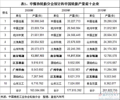 據蓋世汽車網整理的中國橡膠工業協會輪胎分會統計數據(下同),2008-2010年我國輪胎產量最高的前六大企業均為中國佳通、中國正新、杭州中策、三角集團、山東玲瓏和南京錦湖,僅企業間排名有變。而2008年排名第七的的江蘇韓泰,在2009和2010年均退至第九位。