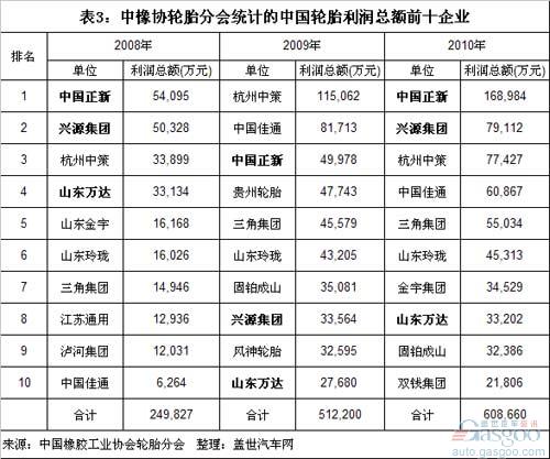 2010年輪胎業利潤總額前十大企業依次是中國正新、興源集團、杭州中策、中國佳通、三角集團、山東玲瓏、金宇集團、山東萬達、固鉑成山和雙錢集團。其中,金宇集團和山東萬達在輪胎產量和銷售收入上均非前十企業。