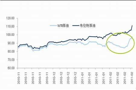 2011年2月,原油期貨走勢真可謂跌宕起伏,而WTI和Brent原油價差曾一度擴大到19美元的紀錄高點。自1月末埃及爆發騷亂以來,投資者普遍擔心政治動蕩將擴散至伊朗等主要產油國,中東地區原油供應及運輸可能遭到破壞。然而,美國方面依舊飽受油品庫存高企的困擾,尤其是NYMEX 原油期貨交割地庫欣地區的原油庫存接近歷史最高水平,因此在最初的半個月間,WTI與Brent原油走勢迥異,價差不斷擴大。然而隨著政局的演變,動亂蔓延至埃及周邊的利比亞、也門、突尼斯、巴林等地,市場開始擔心中東石油供給問題,WTI原油期貨價格在半個月的時間里快速上行,4月合約曾最高上探100美元/桶,布倫特油價也突破了110美元/桶。