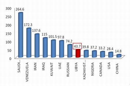 市場關注度極高的地緣沖突主要集中在非洲北部以及中東地區的巴林、伊朗以及也門。從全球的儲量以及產量情況看,目前世界總共可探明儲量為13331億桶,其中OPEC占據其中的10294億桶,其中每天的供應量達到2980萬桶/天,而此次暴亂嚴重的利比亞是OPEC的第八大石油主產國,從地域上劃分,中東地區占據全球儲量的7542億桶,每天產出2436萬桶,非洲占據1277億桶,每天產出971萬桶。