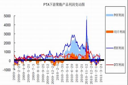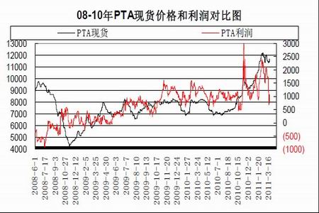 從圖七中可看以,2010年一季度,PTA工廠的利潤空間一度達到了2000-2500元/噸,但至2011年3月份,因日本地震蕩引發的PX暴漲,使得PTA的利潤空間一度下滑至500-1000元/噸. 因PTA產品供不應求,PTA工廠一季度整體維持健康的運行態勢,PX至PTA的成本傳導順利,我們認為PX價格短期內急漲后,導致PTA利潤開始出現縮水態勢,預計隨時間的推移,PX成本將逐步向PTA現貨價格轉移,PTA利潤會逐步向1000-1500元/噸合理區間靠近。