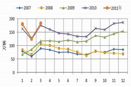 3 月我國汽車產銷增速下滑,月度和季度同比增幅較大回落。3 月,汽車產銷182.73萬輛和182.85 萬輛,環比增長44.99%和44.32%,同比增長5.34%和5.36%,增幅與上年同期相比回落52.35 個百分點和50.43 個百分點。3 月是我國產銷一年中創新高的月份,但是增幅回落了50 多個百分點,同比增長只有5%。汽車工業協會助理秘書長朱一平表示,造成這種情況有5 點原因:一是購置稅優惠政策、汽車下鄉和以舊換新政策的退出;二是燃油價格的不斷攀升;三是部分城市治堵限購政策的實施;四是受油耗準入政策的實施影響,道路運輸車輛市場增長乏力;五是日本地震的影響。對于日本地震造成的影響,目前還不能完整評估,現在從日本得到的信息還不夠清晰、不夠透明,現在還很難全面評估到底影響有多大,仍然不能排除個別關鍵零部件長期不能恢復生產。