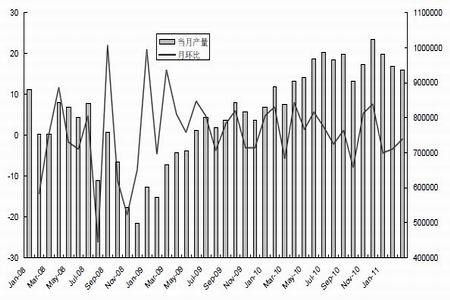 圖為中國PVC 月產量及環比走勢圖。(圖片來源:石油和化學工業協會 美爾雅期貨)