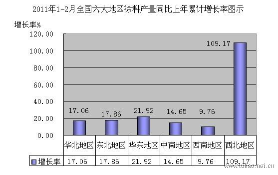 截止2011年2月全國累計涂料(油漆)產量同比上年同月增長率為19.29%,增長率最高的是西北地區,增長率為109.17%。增長率依次排序為:西北、華東、東北、華北、中南、西南。增長率最高的省為貴州省,增長率為802.33%;增長率最少的省新疆,下降了31.09%。