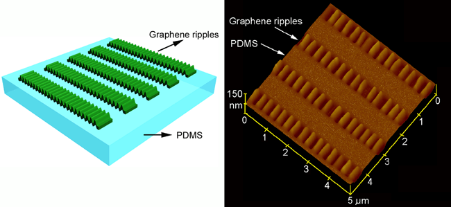 圖1 石墨烯條帶轉(zhuǎn)移到預先施加應力的PDMS襯底上,通過釋放PDMS上的應力得到的周期性波紋狀折疊石墨烯條帶結(jié)構(gòu)。