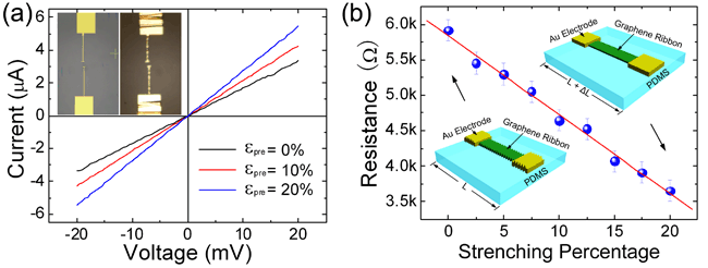 圖2 (a) 周期折疊石墨烯應力傳感器在不同加載應力下的I-V曲線。插入圖是折疊前后的光學照片對照。帶有兩端電極的石墨烯條帶整體轉(zhuǎn)移到預加應力20%的PDMS襯底上,釋放應力后得到了周期折疊石墨烯應力傳感器。石墨烯條帶折疊前的寬度是1.5μm,長度是22.8 μm。(b) 折疊的石墨烯應力傳感器電阻隨應力的變化關(guān)系。當應力從0變化到20%時,電阻從5.9 kΩ線性降低到3.6 kΩ。最小電阻3.6 kΩ為完全放松狀態(tài)的石墨烯的電阻。對應應力傳感器件的品質(zhì)因子為-2。