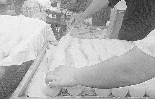 出售饅頭的老板:塑料布不刷油,省油嘛,那個也不用擦籠屜。好處就是省工省時。刷油可費事,還費人工。
