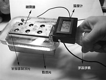 在靜安區青少年活動中心上萬元的資助下,她反復試驗,終于研制出了手持式地溝油識別儀器。這種儀器呈長方形,有一根手柄。它的外殼上裝有半導體制冷片、散熱片,通電后能迅速制冷;儀器上部裝有紫銅片,檢測時,可將被測油滴到紫銅片上,手柄前端是一個溫度計,顯示制冷溫度。