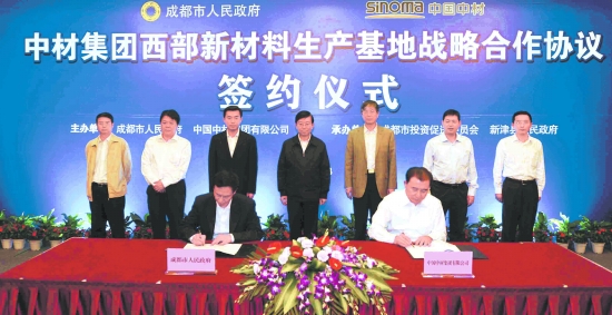 昨日,成都市政府與中國中材集團有限公司正式簽署西部新材料生產基地戰略合作協議。中材集團將在成都市新材料產業功能區投資30億元,建設其西部新材料生產基地,重點進行復合材料、人工晶體、工業陶瓷、玻璃纖維等新材料的研發和生產。