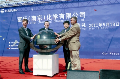 五月十八日,美國富樂公司位于南京化學工業園區的膠黏劑廠正式開業投產。該廠占地二點二萬平方米,總投資一千二百萬美元,年產能一萬噸,產品包括聚氨酯黏合劑和其他可廣泛應用于建筑、過濾器、軟包裝、太陽能、紡織、木制品的反應型膠黏劑。南京新工廠將與富樂公司在上海張江高科技園區的亞太區技術中心緊密合作,為中國及亞太地區的客戶提供本地化解決方案和優質服務。圖為富樂南京工廠開業典禮現場。