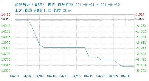 從圖中看出,4月(4.1–4.30)滌綸短纖價(jià)格呈下滑走勢(shì)。截止月末滌綸短纖(直紡1.4D)價(jià)格在13600元/噸左右較月初14350元/噸跌幅在5.23%,同比增長(zhǎng)28.30%。