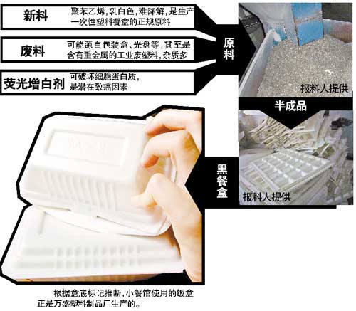 一個月以來,按照線人舉報,本報記者先后前往東莞、惠州等地調查一次性發泡餐具的“產業鏈”,發現使用廢塑料生產餐盒的舉報屬實,有些企業還涉嫌在生產餐盒過程中使用熒光增白劑。這些“黑餐盒”每天經過大卡車不停運往珠三角各地,其中東莞一家企業的產品流入到黃埔等地工業區附近的餐館。