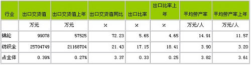 從行業產品出口交貨值和勞動生產率水平看,2011年1-4月份錦綸行業產品出口交貨值為9.91億元,占紡織全行業的0.39%;出口交貨值比上年同期增加72.23%;該行業產品出口比率(出口交貨值/工業銷售產值)為5.65%,而上年同期為4.65%,表明該行業產品出口狀況較好;從勞動生產率的水平看,2011年1-4月份錦綸行業平均勞產率(工業增加值/從業人數)為14.91萬元/人,而上年同期為11.57萬元/人,表明該行業勞動生產率的實際水平較為理想。