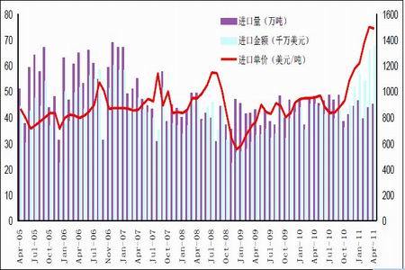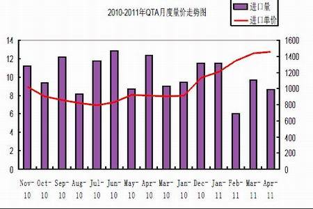 圖為2010-2011年QTA月度量價走勢圖。(圖片來源:海關總署)
