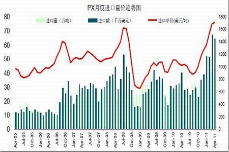 3.海關統計,我國2011年4月份精對苯二甲酸(海關稅則號29173611)進口量為45.46萬噸,較2011年3月增加1.38萬噸,平均報關單價1493.75美元/噸;其它對苯二甲酸(海關稅則號29173619)進口量為8.62萬噸,較3月減少1.05萬噸,平均報關單價1453.84美元/噸。