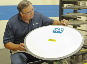 服務于PPG阿拉巴馬州亨茨維爾航空玻璃生產工廠的Jimmy Black正在對舷外表面采用新型OPTICOR(TM)高級透明材料的 “灣流”G650(R)商務機客艙玻璃舷窗進行檢查。