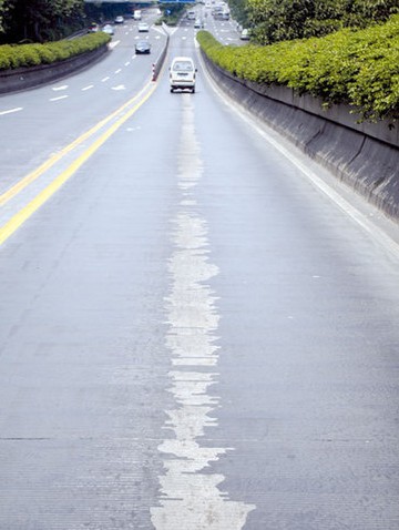 記者看到,“黑漆”脫落的地方,露出原有的水泥路面。有意思的是,“黑漆”脫落的地方,并不僅是汽車車輪經常駛過摩擦的車道兩端,車道中央摩擦較少的地方也有。掉漆的路面,或呈塊狀,或呈條狀,使該立交路面看起來很“斑駁”。