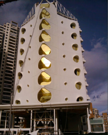 酒店的新外表是由西班牙的建筑師Vicente Peidró設計。該設計的最大挑戰性是生產面墻中心的九塊大型的彎曲三角型材。模塑成型八塊5毫米厚玻璃鋼部件,然后把他們粘接在一起是最有成本效益的,在粘接過程中由Miraplas設計的金屬夾架能夠使部件在合適的位置。