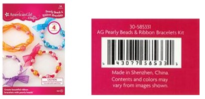 此次被召回的兒童飾品為珍珠緞帶手鏈套裝,56件/套,珍珠分粉、藍、橙和白4種顏色,部分粉色珍珠上還繪有蝴蝶圖案,絲帶分橙、紅、藍和紫4種顏色。產(chǎn)品名稱為AmericanGirlCrafts,SKU碼30-585331標在外包裝背面右下方。該兒童飾品自2009年9月~2011 年6月在全美的Michaels店及其他零售店銷售,單價為8美元/套。
