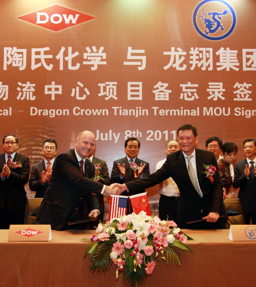【中國天津,2011年7月8日】 陶氏化學公司(紐約證交所代碼:DOW)和中國最大的綜合性化學物流服務提供商之一龍翔集團控股有限公司(香港證交所代碼:935)今天在天津簽署合作備忘錄,擬在天津南港化工園區合資興建陶氏化學天津物流中心。該項目規劃投資2億美元,將成為陶氏在中國的第一個化學品物流中心,同時也將成為陶氏全球最大的化學品物流中心。該項目將發揮戰略性物流中心的作用,有力地支持陶氏在大中華區和北亞區持續強勁的業務增長。