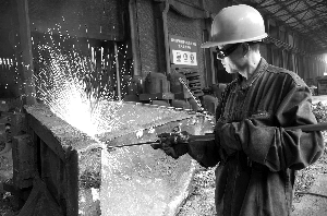 益陽橡膠塑料機械集團有限公司近日通過開展技術革新,增加保溫冒口和吹沙等工藝,大幅度提高鑄造件質量,廢品率由原來的8%降到2%,促進了企業經濟效益的提升。 圖為鑄造員工正在清理鐵包沙。