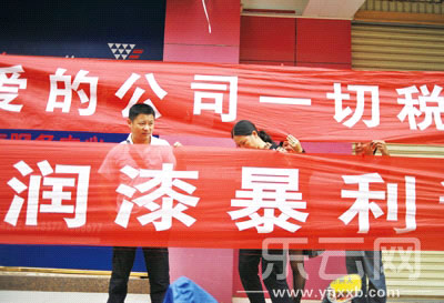 無奈之下,蔣菊琴等人于昨天中午10時(shí)聚集在云南愛的涂裝服務(wù)有限公司(大商匯建材市場B51-16號(hào))大門口,任憑他們怎么敲門,公司大門都保持緊閉狀態(tài)。其中一女士氣的將手里的一枚雞蛋砸向大門。不過只砸了一枚,他們想和平解決問題。他們昨天原計(jì)劃給該公司總經(jīng)理準(zhǔn)備了20枚雞蛋,一箱礦泉水,兩條橫幅。