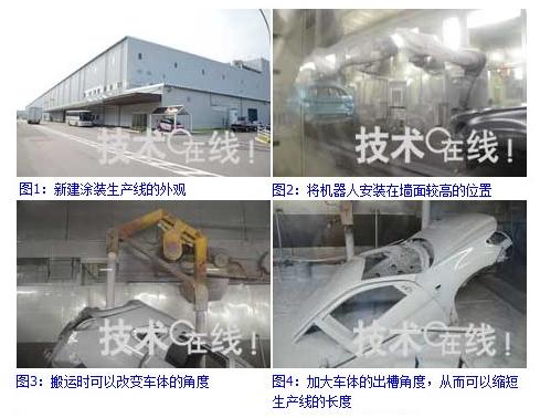 三菱汽車最近向新聞媒體公開了新建的生產線。成本削減的實現方法包括,在中層涂裝工序和上層涂裝工序中減少涂裝機器人的數量;導入新型涂裝槍以減少浪費的涂料;在下層涂裝工序中導入“全球首款”(三菱汽車)車體搬運機,從而縮短了生產線的長度。