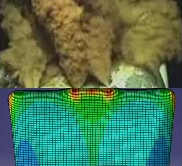 他們緩緩將矩形平臺傾斜下降,附屬的鉆井隔水管開始彎曲。用顏色編碼的模擬器沿著管道標明那些可能破裂的點:藍色和綠色表示材料仍是完整的,黃色和紅色標明它是破裂的。小組發(fā)現了四個很可能發(fā)生破裂造成漏油事故的區(qū)域,并用一張水下機器人在事故后不久拍攝的破壞了的管道的照片與其中的一個區(qū)域相比較,結果是近乎完美的吻合。