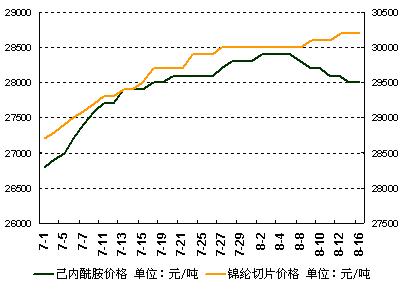 1、成本方面.8月初原料價格開始出現(xiàn)回落。截止8月16日國內(nèi)市場上己內(nèi)酰胺報價多在28000元/噸左右,較月初下跌400元/噸。切片價格則表現(xiàn)較為穩(wěn)定,國內(nèi)主流常規(guī)紡切片報價在28900元左右,高速紡約在29500-30000元。雖然原料價格走緩,但值得注意的是,國內(nèi)己內(nèi)酰胺的供應(yīng)還是偏緊的,9-10月有較為密集的裝置檢修,商家?guī)齑娌欢啵鲐浺庀虿皇呛苊黠@。另一方面,受到己內(nèi)酰胺反傾銷案的影響,進(jìn)口貨也會有所減少。因此,短期內(nèi)己內(nèi)酰胺價格會比較穩(wěn)定,但并不排除小幅下跌的可能;而從長期看,若無其他利空因素出現(xiàn),己內(nèi)酰胺的價格還會有上升的空間。