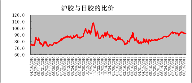 圖1: 滬膠與日膠的比價(jià)關(guān)系
