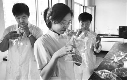 遼寧省環境監測實驗中心的嗅辨師正在對采集到的空氣樣本進行嗅辨。