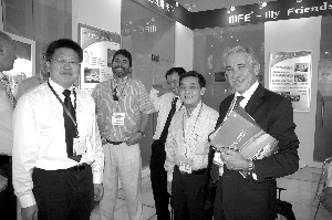 以持續創新為成長動力的華東理工大學華昌聚合物有限公司在9月7日開幕的第十七屆中國國際復合材料展上,展示了碳纖維專用環氧乙烯基酯樹脂、阻燃型乙烯基酯樹脂等一批最新開發的產品和技術,引起國外客商極大興趣。 圖為9月8日,華昌公司董事長兼總經理劉坐鎮(左)與巴西、俄羅斯、印度和泰國客商洽談成功合作項目。