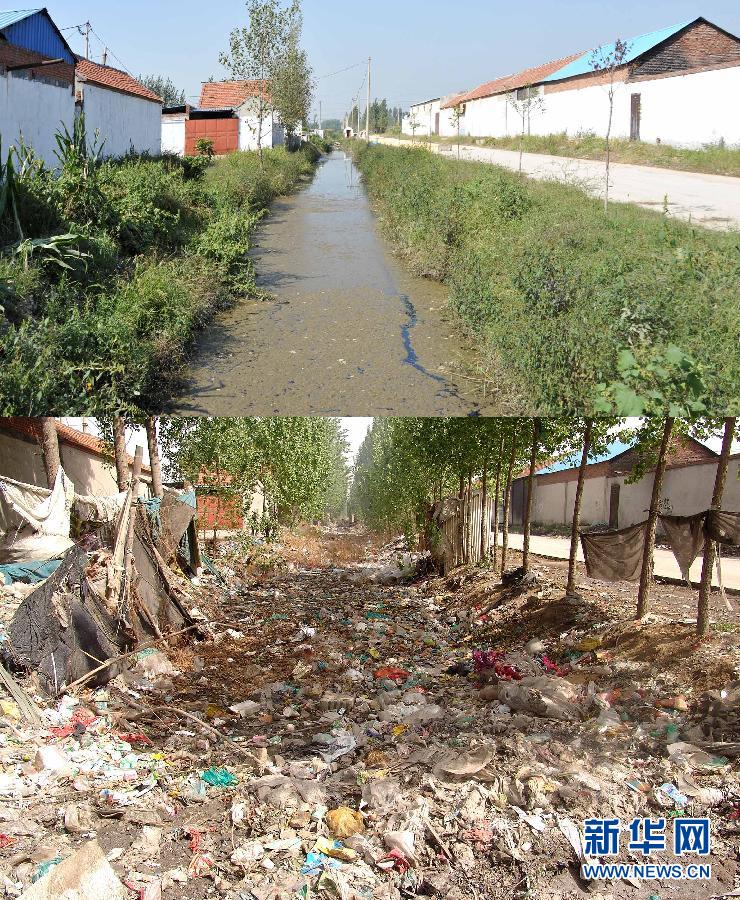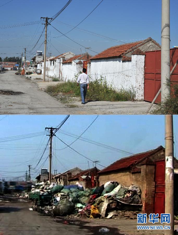 9月22日,取締廢舊塑料市場后的白云湖鎮石東村(上圖)與取締前的對比(下圖為視頻截圖照片)(視頻拍攝時間為2011年3月10日)。新華社記者 徐速繪 攝