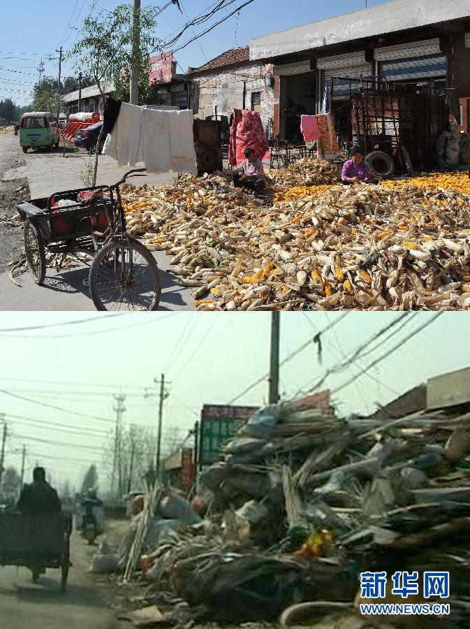 9月22日,取締廢舊塑料市場后的白云湖鎮石西村道路環境(上圖)與取締前的對比(下圖為視頻截圖照片)(視頻拍攝時間為2011年3月10日)。新華社記者 徐速繪 攝