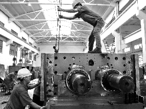 圖為總裝車間員工正在加緊組裝GN255密煉機。