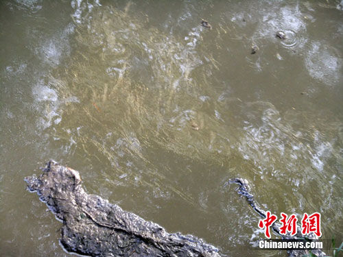 金大地化工排出的乳白色污水上還漂浮著金黃色似油一般發(fā)亮的東西。