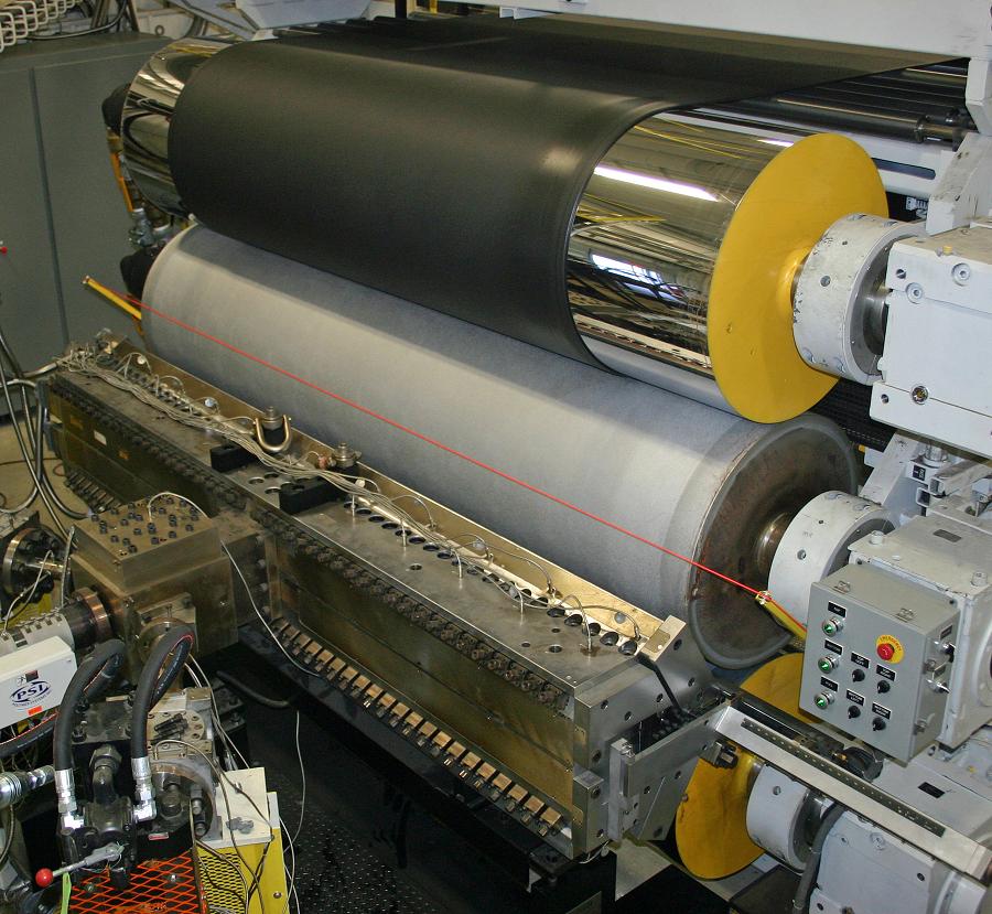 1)左下方EDI Ultraflex®模頭的后視圖。模頭背后是一個3層分配塊,分配塊接收來自三臺擠出機的聚合物。成品板材離開模唇后,直接進入右側的成卷機。