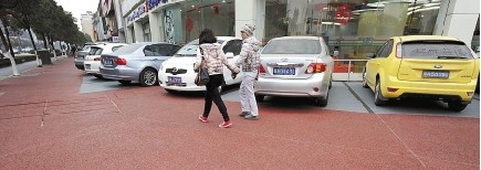 最近,杭州文三西路上有幾段人行道都玩起了“變臉”,不再是原來灰撲撲的石板路了,都成了“大紅臉”,原來的石板換成了類似瀝青的材料,有的表面還刻出了像地磚一樣的紋路。